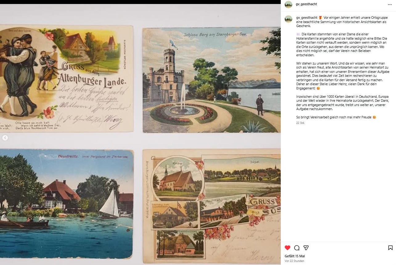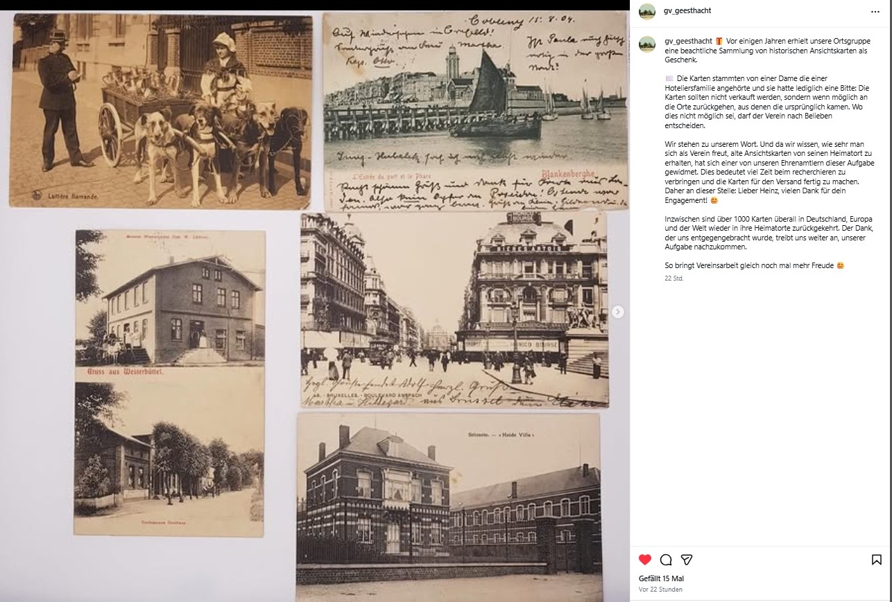 Mehrmals pro Woche postet der Geschichtsverein Geesthacht eine kleine Story auf Instagram. Dabei geht es z.B. um Stücke aus dem Archiv oder um unsere Vereinsarbeit. Auch ohne Instagram-Account können Sie dabei sein: Stöbern Sie einfach durch die Galerie. Durch einen Klick auf eines der Bilder vergrößern Sie die Ansicht. Mit den Pfeiltasten links und rechts können Sie das nächste Bild öffnen.