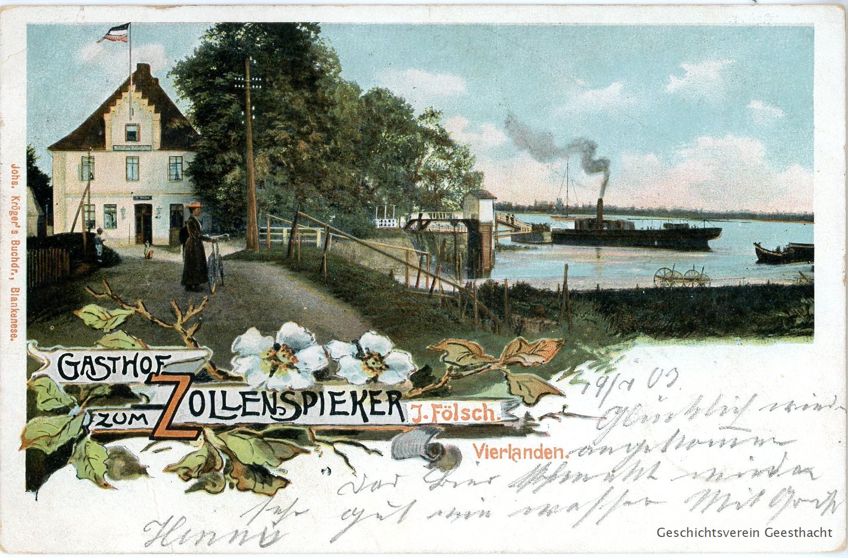 Seit 1200 wurden hier Zölle erhoben. Für die Herrschaft von Lübeck und Hamburg waren sie ab 1420 über fast 400 Jahre eine bedeutende Einnahmequelle. Bereits im 16. Jahrhundert gab es eine Frischwasser-Leitung. Diese „Wasserkunst“ wurde gebraucht, denn das Fährhaus Zollenspieker war zum pulsierenden Handels- und Vergnügungsort geworden. Ochsentrieb per Fähre, durchreisende Gaukler und ein reger Schiffshandel mit Getreide, Heringen, Salz, Gewürzen. Der Schiffsverkehr nahm gewaltige Ausmaße an – 1838 passierten 22.000 Schiffe das Zollenspieker Fährhaus.