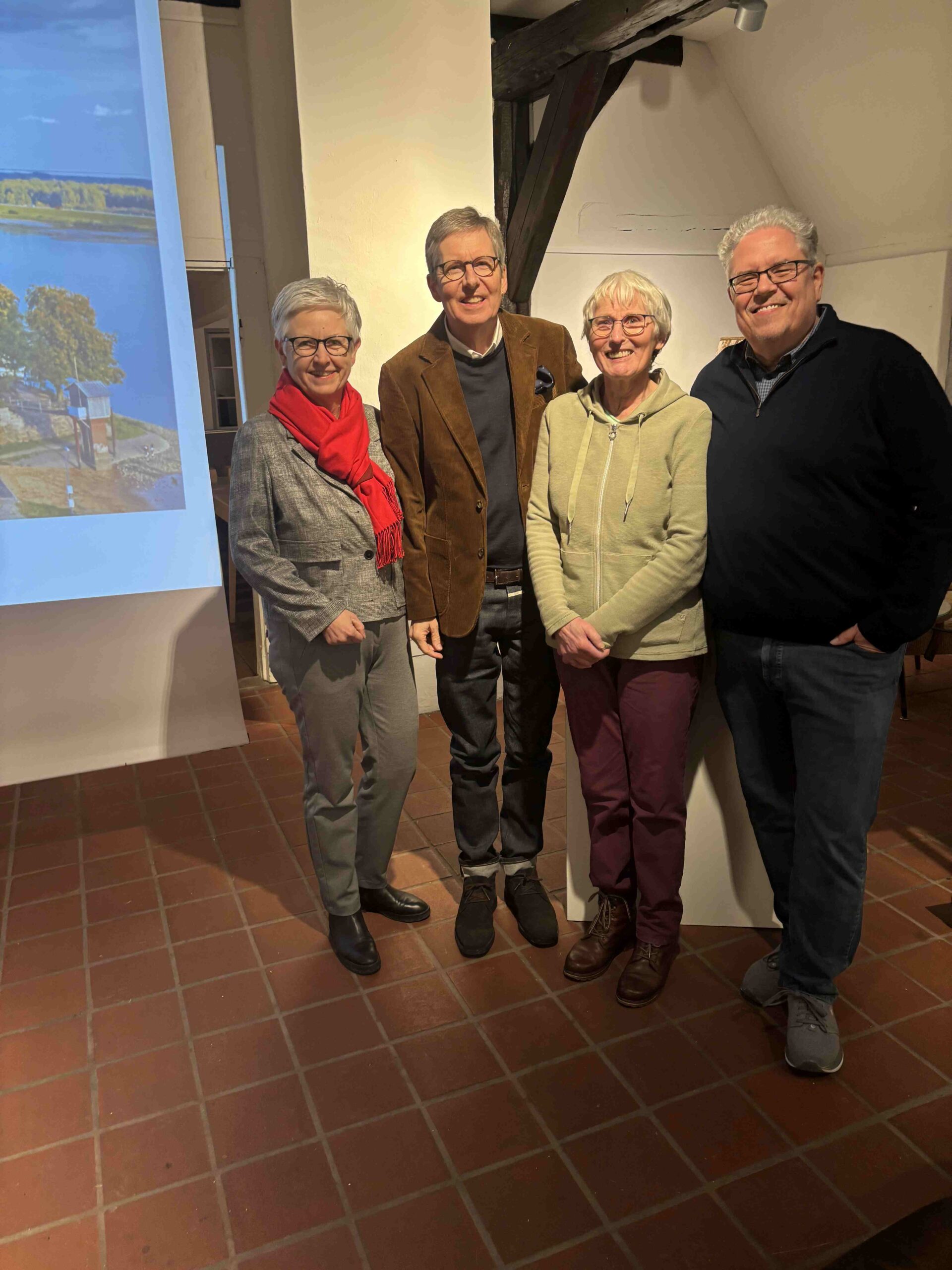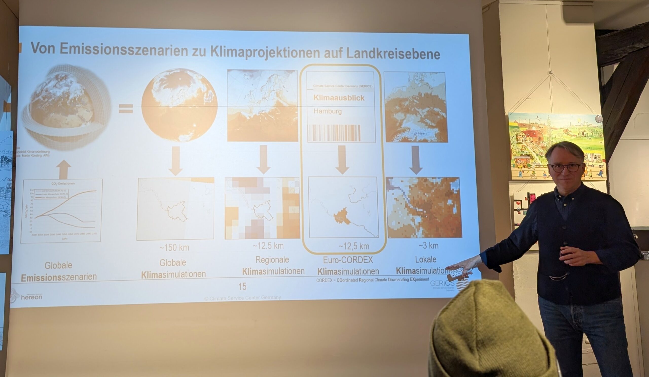 Die Geschichte des heutigen Helmholtz-Zentrum Hereon stellte der Naturwissenschaftler Dr. Peer Seipold im Krügerschen Haus vor. Geesthacht ist schon lange ein bedeutender Wissenschaftsstandort. 1956 wurde die GKKS gegründet, die Gesellschaft für Kernenergieverwertung in Schiffbau und Schifffahrt. Peer Seipold, selbst bei Hereon tätig am „GERICS, Climate Service Center Germany“ gewährte auch Einblick in seine Forschungsfelder: Klimaaussichten, aktuelle Entwicklungen im Klimaschutz und die Anpassung an die Folgen des Klimawandels. Für die Stadt Geesthacht hat das Gerics ein Modell und eine Broschüre zur Gefahr von Starkregen und Sturzfluten erstellt. Dass die internationale Spitzenforschung in Geesthacht eine solche praktische lokale Anwendung findet, faszinierte das Publikum.